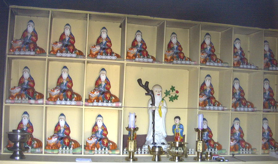 generic statues of San-shin surrounding a larger statue of a San-shin-dosa