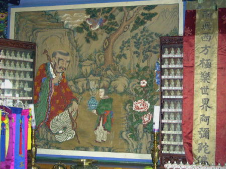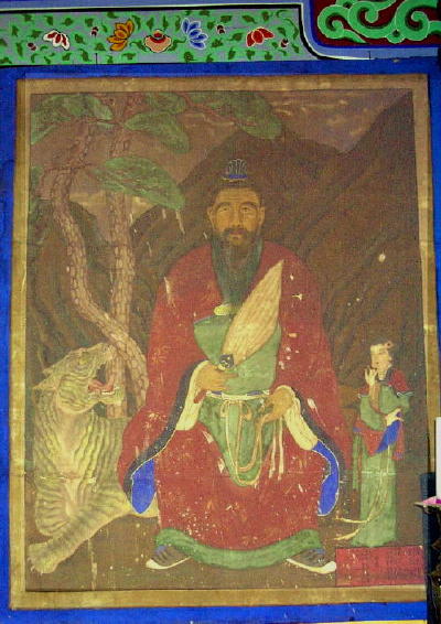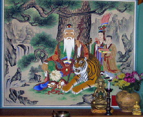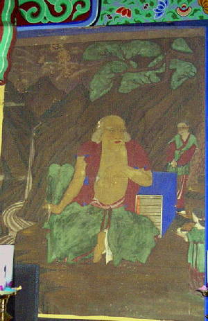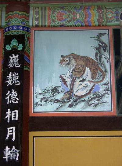 | Won-dang-san Mun-gang-sa [Culture-River Temple] has a great new-but-classic San-shin painting (with Bodhisattva statue in front!), and also a unique wall-painting -- Founder of Seon [zen] Buddhism Bodhi-dharma sitting with a tiger, as if he were a San-shin! (playful mixing of genres like this gets ever more common in Korea these days). |