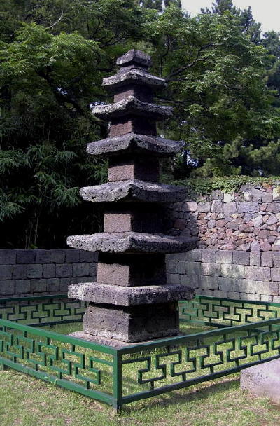 | Won-dang-san Bul-tap-sa [Buddha-Pagoda Temple] is a nice new nun's monastery built on an old site. It features the San-shin and Dok-seong paintings above, and the oldest pagoda on Jeju Island (perhaps the only pre-1948 pagoda extant there). It is handsome, 5 stories in the Joseon-Dynasty style, and is Korea's only pagoda made of black volcanic basalt stone like the famous Dol-harubang statues. |