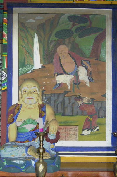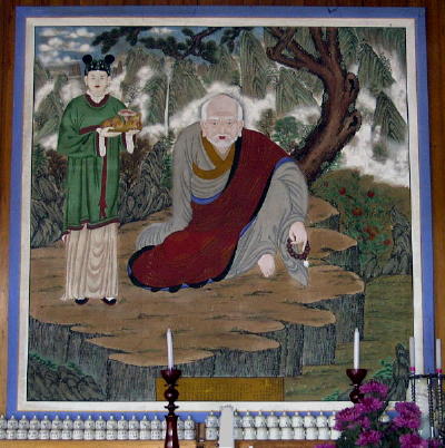 | Seong-rim-sa [Sage-Forest Temple] enshrines these somewhat unusual San-shin and Dok-seong paintings. |
