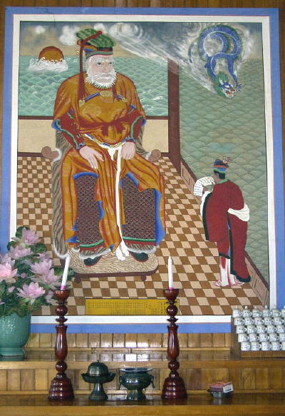 | Also there, San-shin in a "heavenly" Shin-jung icon (left), and a regal Yong-wang with an official and a blue dragon (right). |