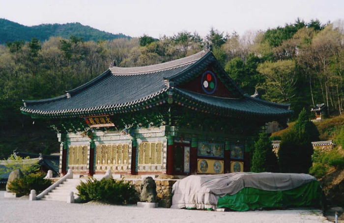 center. Set in the wall above the rock is the largest, most magnificent San-shin painting ever made in Korea -- maybe 12 feet high and 18 feet across!!! (4m x 6m). Stunning, complex, amazing. |