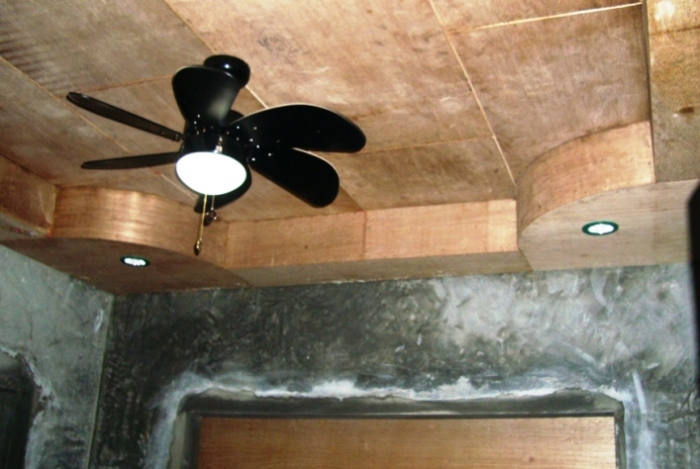 | unfinished ceiling & walls, but with fan & lights operating, and installing the windows, in the maid's room (only bedroom on the 1st floor) |