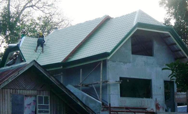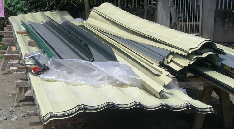 | beige steel "tile" sheets await installation as our roof |
