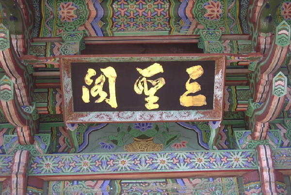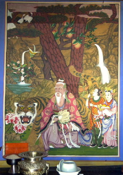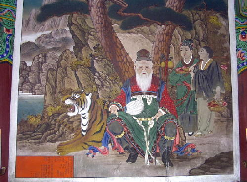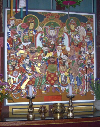 | The long and thin Yeosu Peninsula is the extreme southwest point of South Jeolla Province; a very long drive to get down there, but well-worth it. At Dalma-sa [Bodhidharma Temple, named after the founder of Seon or Zen Buddhism], the new San-shin painting (left) has a very rich background! Yeong-chui-san Heung-guk-sa [Safety-of-the-Nation Temple] was founded in 1195 by the great master Chineul Bojo-guksa, making it the second most important temple in the Yeosu area. It enshrines no San-shin at all, nor any other folk-deities (a case of Buddhist opposition to them -- see page 184 in my book). However, in Heung-guk-sa's "Spirit Assembly" altar-painting (right), San-shin is quite prominent at the center. |