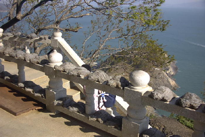 | The incredible Hyang-il-am [Rising-Sun Hermitage] is one of Korea's three special temples for worshipping Gwanseum-bosal [Avalokitesvara, the Bodhisattva of Compassion]. Founded by Korea's unique religious-genius "Great Master Wonhyo" in 644 AD, it's now part of the Dado-hae Coastal National Park. It perches within a jumble of gigantic broken boulders piled 200 meters (600 feet) high on the southern tip of Dolsan Island, off the southern tip of Yeosu. It's certainly the most famous place of the Yeosu region, and also sees quite a lot of worship of the Yong-wang [Dragon-King of the Waters, a figure closely associated with Gwanseum-bosal in both Buddhism and folk-tales]. |