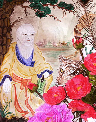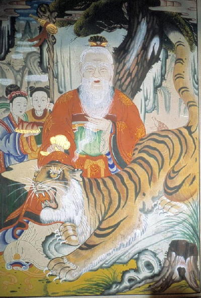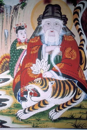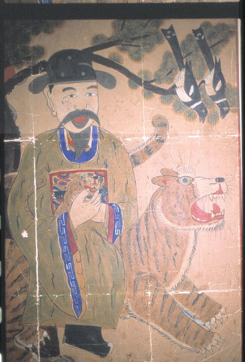 | The two simple-but-excellent mushindo [painting of a spirit used by a Manshin] above are more typical Shamanic types than the other more Buddhist-temple-type paintings on these pages. The Mountain-spirit rides on his tiger as if it were a horse, and no dongja-servants are present. The spirit on the left holds a typical white-crane-feather fan in his left hand while seeming to make a mudra [esoteric Buddhist hand-signal] with his right. The one on the right folds his hands over his tiger-rank-patch (worn by a royal minister), making it look like he is cradling a tiger-cub -- this is unique in my collection! Two magpies, symbols of good fortune and messengers from Heavenly spirits, speak down to the tiger from a pine-branch. |