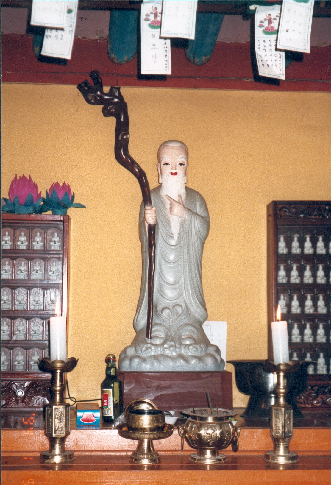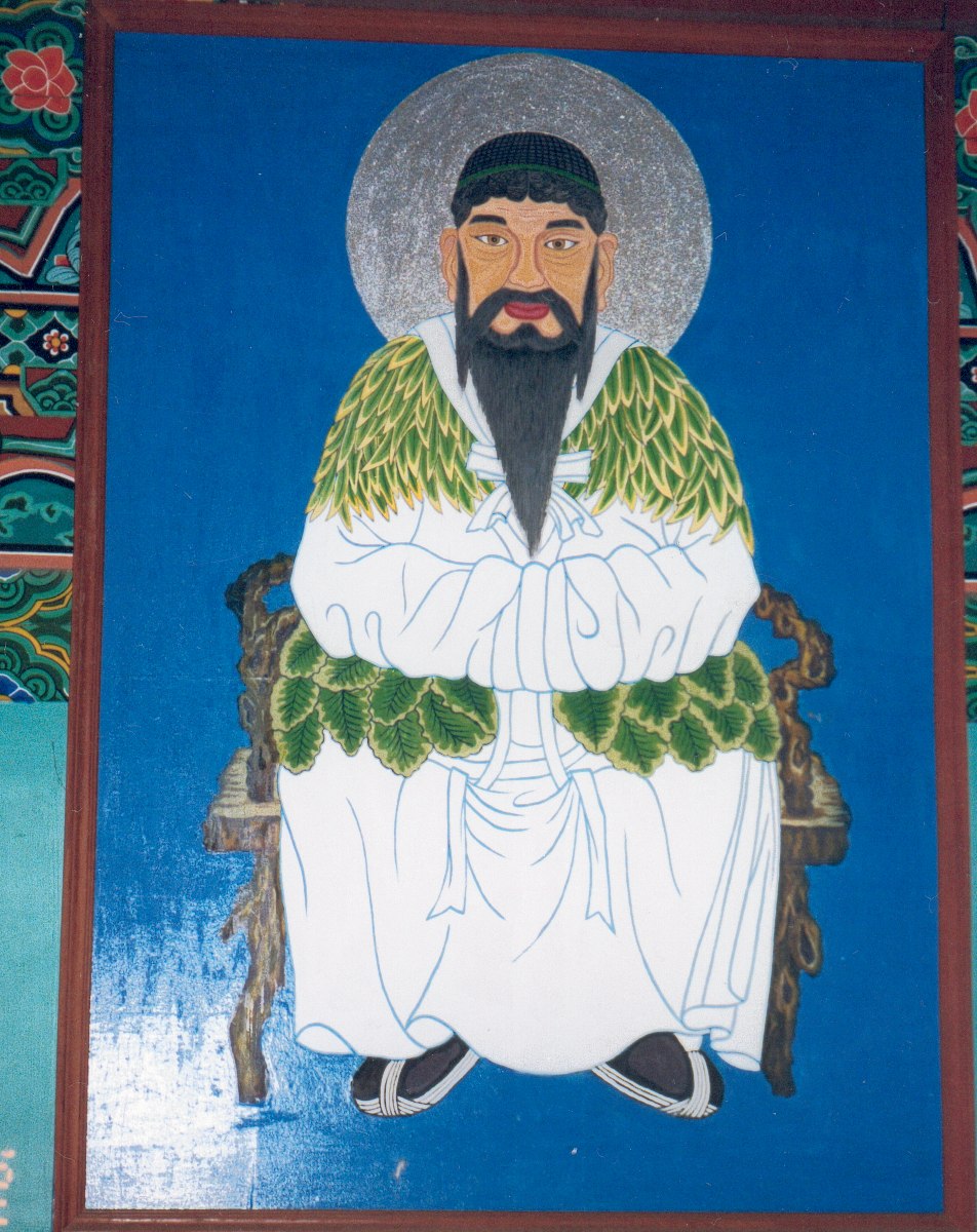 | ABOVE: Portrait of Korea's first king Dan-gun; note the leaf-mantles (two different species!) on his shoulders and waist. Refer to pages 132-139 in my book. BELOW: a statue of a San-shin-dosa (see pages 28-29) in that same sextagonal shrine. |