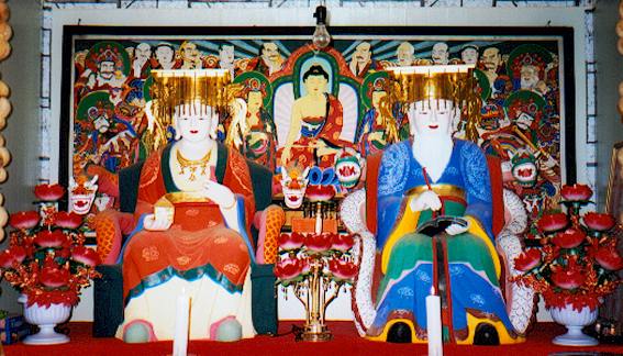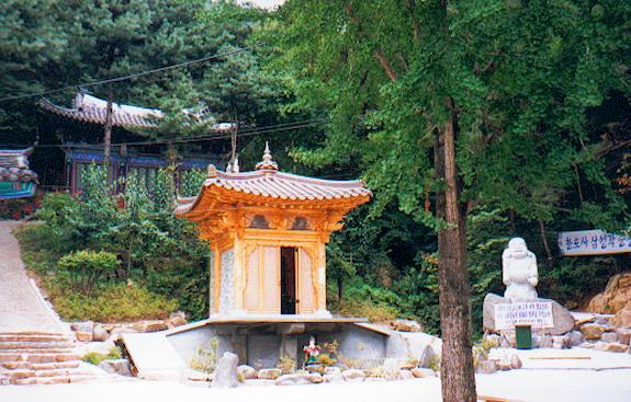 | ABOVE: the "Heavenly King Palace" shrine, built above a pond, and the Grandmother & Grandfather "Cheon-shin" inside it (in front of a Je-seok-bul painting; see pages 104-105). The Sam-seong-gak can be seem up behind it, and a Chinese-style Mireuk-bul [Buddha of the Future] stone statue is on the right. |