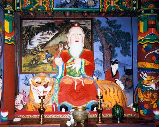 | LEFT: inside the Sam-seong-gak, a gigantic San-shin statue (missing the staff that should be in his right hand!) sits in front of an old San-shin taeng-hwa, which itself is partially covering a San-shin icon painted on the wall of the shrine. |