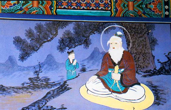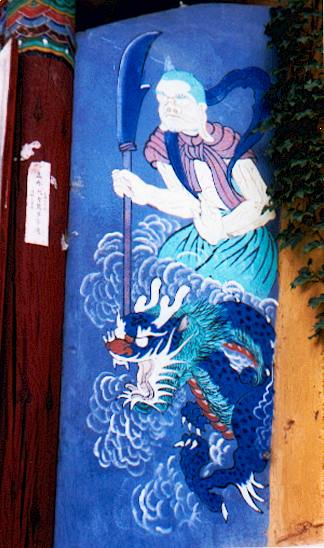 | BELOW: a nice painting of a Shin-seon holding ginseng, from an outer wall of the Sam-seng-gak; he may be intended to represent a San-shin. |