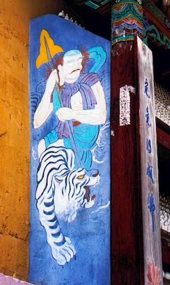 | Twin White Tiger and Blue Dragon door-gardian paintings, from the main Mireuk shrine at Yong-ho-sa. |