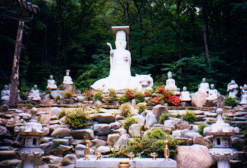 | There are actually two temples on Cheongju City's Uam-san called Yong-ho-sa [Dragon Tiger Temple]; I don't know why this is since it is the standard ruled that no two temples in the same province should be registered with the same name. The first, smaller, lower one is briefly featured on the previous page. This page shows photos from the larger, higher-elevation and more-famous one. The name is quite powerful, invoking the blue Dragon of the East and white Tiger of the West, powerful landscape guardians of pungsu-jiri [geomantic theory]. The abbot-monk who designed the unique artwork in this temple (focusing on the Mireuk-bul, or Maitreya Buddha, the world-teacher who will come someday) is a very nice, spiritual and fascinating guy. |