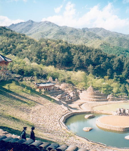 | Two more of my shots of the Samseong-gung, featuring their "jade-comma"- shaped pond (or embryo, cashew-nut, fetus or half-of-yin-yang -shaped; anyway, an ancient Korean form), performance area, Main Shrine and the magnificent surrounding scenery of Jiri-san (Samshin-bong / Three Spirits Peak area). |