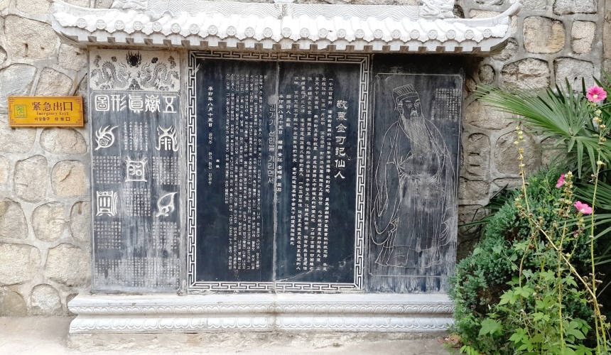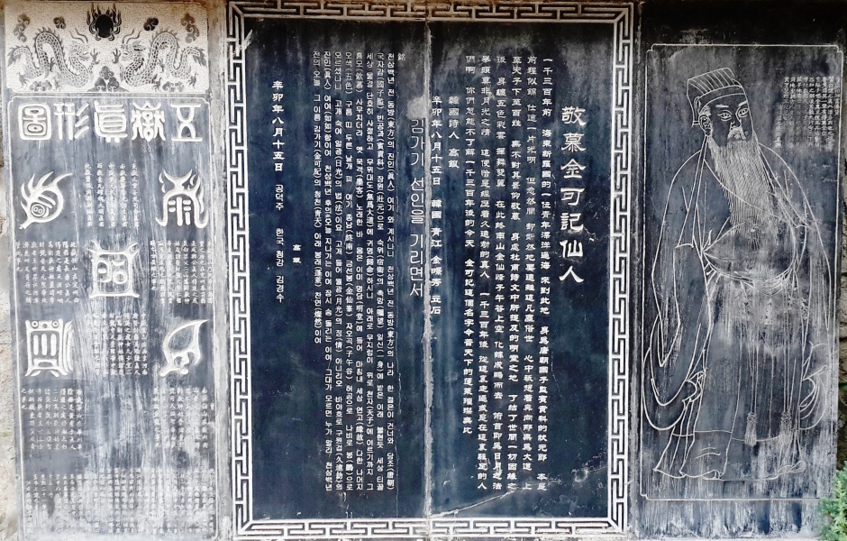 | The memorial biseok plaques: a full potrait of Kim Ga-gi, a proclamation of his historic significance as a realized "Immortal" in both Chinese and Korean, and on the left, a reproduction of the most famous "Diagram of the True Images of the Five Marchmounts" [五嶽真形圖, O-ak Jinhyeong-do in Korean]. |