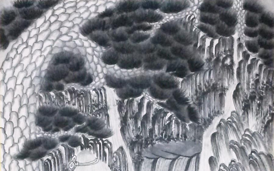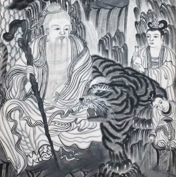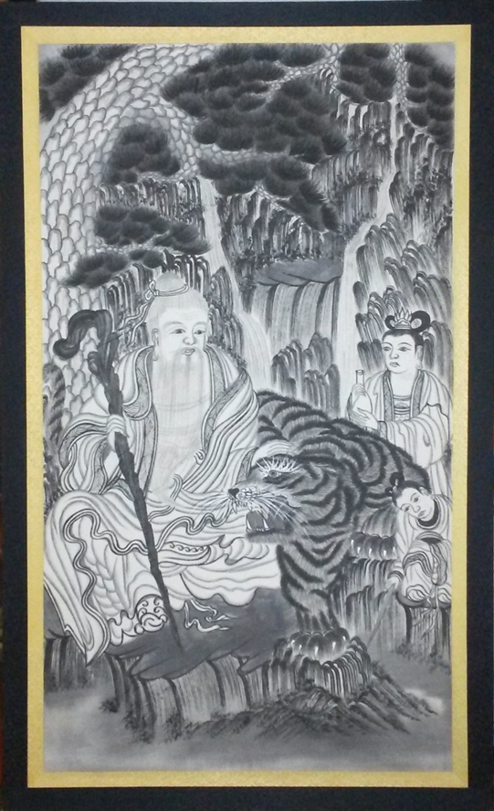 | Sanshin Painting Gift from Mt. Gyeryong-san! Good new 2017 black-ink-brushed-on-white-paper artwork, by resident Master Korean-Shamanic artist Kang No-shim |
