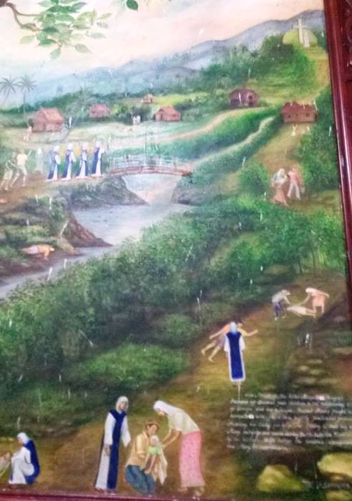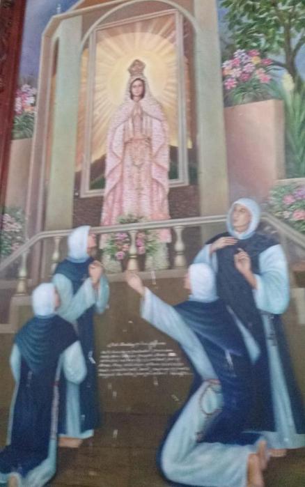 | The history of this church is told in a series of ten paintings -- humble beginnings as an impoverished convent caring for the poorest; a pious old man makes a prediction of holy visitations; the apparitions of Mother Mary and her miracles begin; a million people visit and donate cash; construction is ongoing.... |