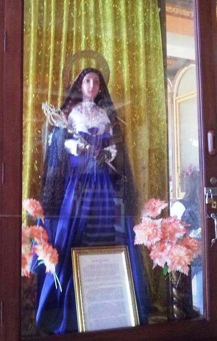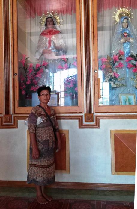 | Pilgrims crowd to pray to the "miraculous" statue of "Mary as Queen of Heaven", which began to 'cry bloody tears' a decade or so ago, and has been credited with thousands of healings, wish-grantings and other miracles since then -- the lobby is filled with written testamonials, discarded medical equipment & etc. |