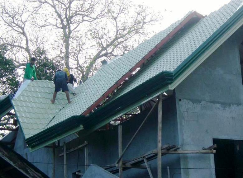 | beige steel "tile" sheets await installation as our roof |