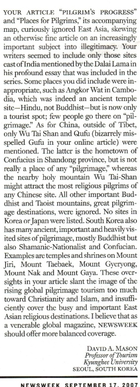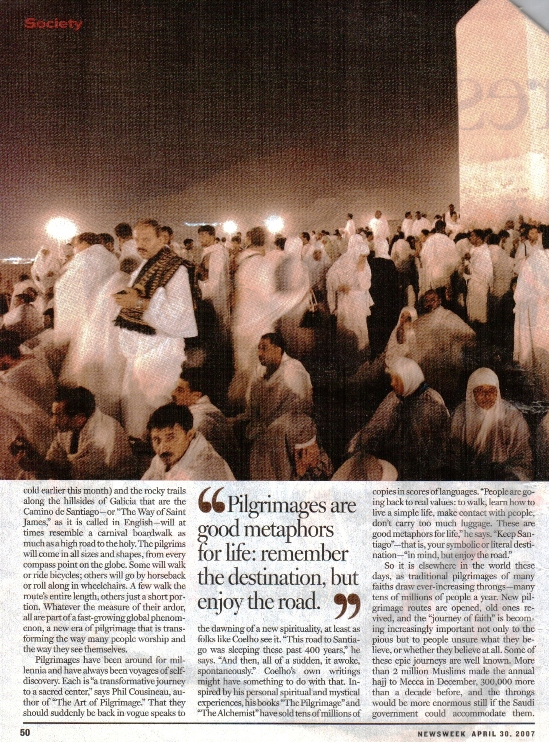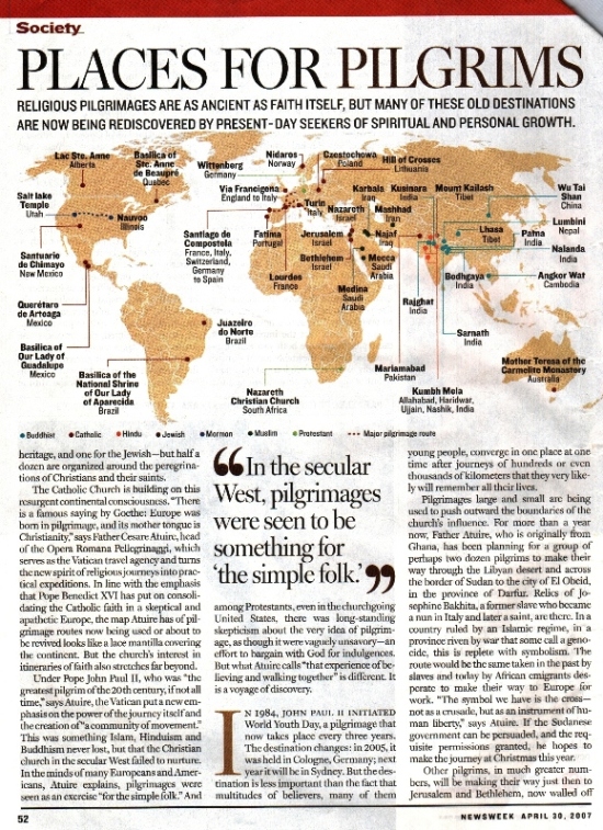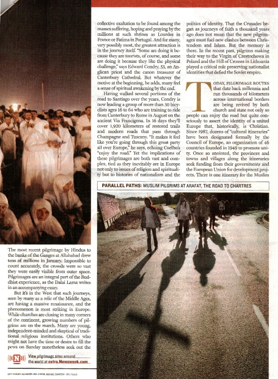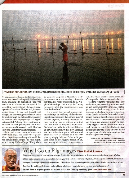 | The Newsweek articles I was reacting against (Links to their online versions no longer work): "Pilgrim's Progress: The world is rediscovering the power of pilgrimage" "Journeys of Faith: a guide to some of the world's main places of pilgrimage" "The Path to Enlightenment" essay by the Dalai Lama These are shown below |