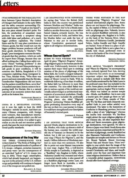 | My Letter-to-the-Editor printed in Newsweek International Sept. 17th 2007 |
