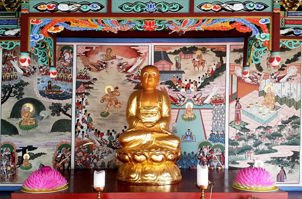 | Golden Statue of Wonhyo in Buddha-mode, and paintings of scenes of his life, the Main Altar of Jeseok-sa, the temple on his birthplace, in Gyeongsang City. |