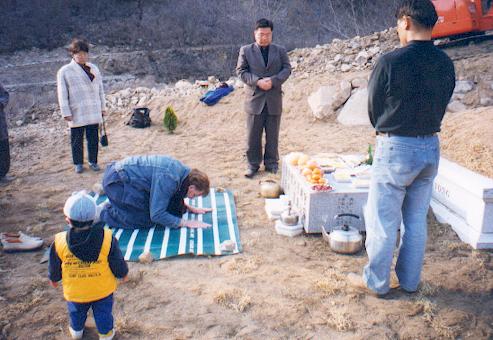 bowing at Zo's tomb, April 2000 (photo by Eugene Campbell)